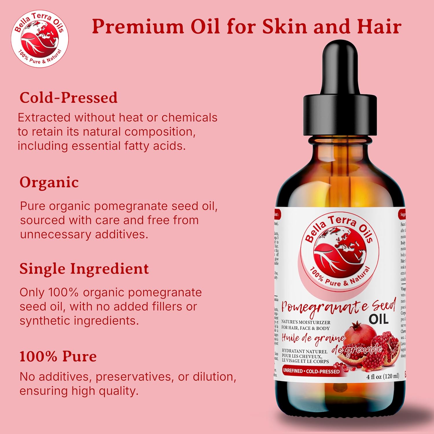 Bella Terra Oils – Organic Pomegranate Seed Oil 2oz – Cold-Pressed & Pure, Rich in Nutrients for Skin & Hair, A Beauty Essential